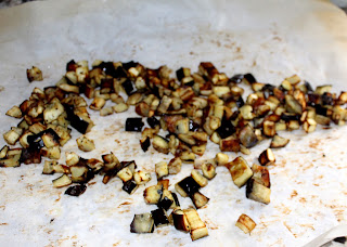 Staviti na pleh pek papir, staviti isečen patlidžan, dodati 2 kašike maslinovog ulja, pobiberiti, posoliti malo i posuti sa suvim začinom,promešati i staviti u rernu da se peče na 225°C oko 15 do 20 minuta dok patlidžan ne omekša i ne porumeni, ako hoćete, možete promešati na polovinu pečenja.