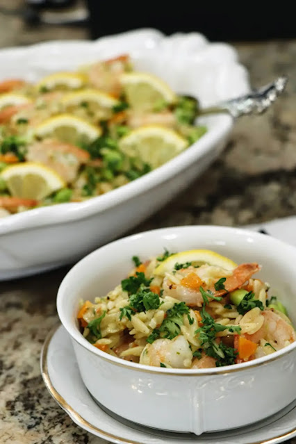 U veću zdelu staviti orzo pastu. Ako vam se pasta slepila prilikom stajanja dodajte malo od vode u kojoj se pasta kuvala i viljuškom je rastresite.Dodajte krastavac isečen na kockice, mladi luk isečen na kolutove, paradajz iseći na sitnije kockice, maslinke preseći na polovine ili četvrtine, iseckan peršun i mirođiju, grilovane šrimpove i na kraju preliti sa prelivom u kom je ljubičasti luk i sve to dobro izmešati. Probati da li je potrebno još limunovog soka, soli i bibera i na kraju posuti feta sirom.Ostaviti da se malo ukusi sjedine i može se poslužiti hladna ili sobne temperature.Ako vam šta ostane, može se poneti na posao za ručak.